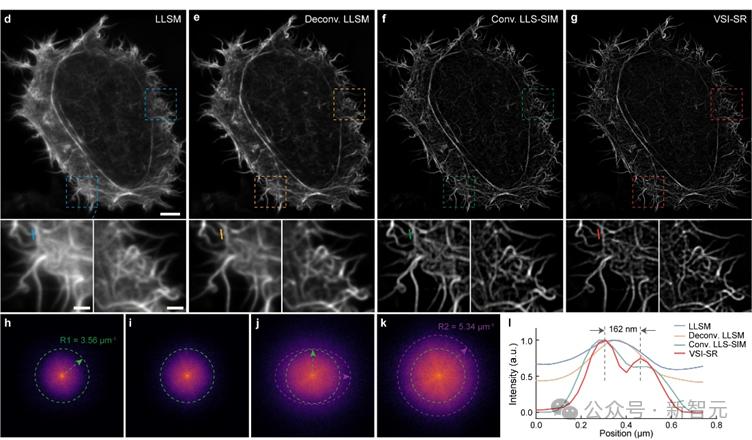 研究小组在亚细胞结构肌动蛋白微丝上测试了虚拟结构光的明显照明(VSI-SR)结果表明,与其他方法相比,虚拟结构照明图像更加清晰,不仅包含了更多的频率信息,而且保持了各向异性。