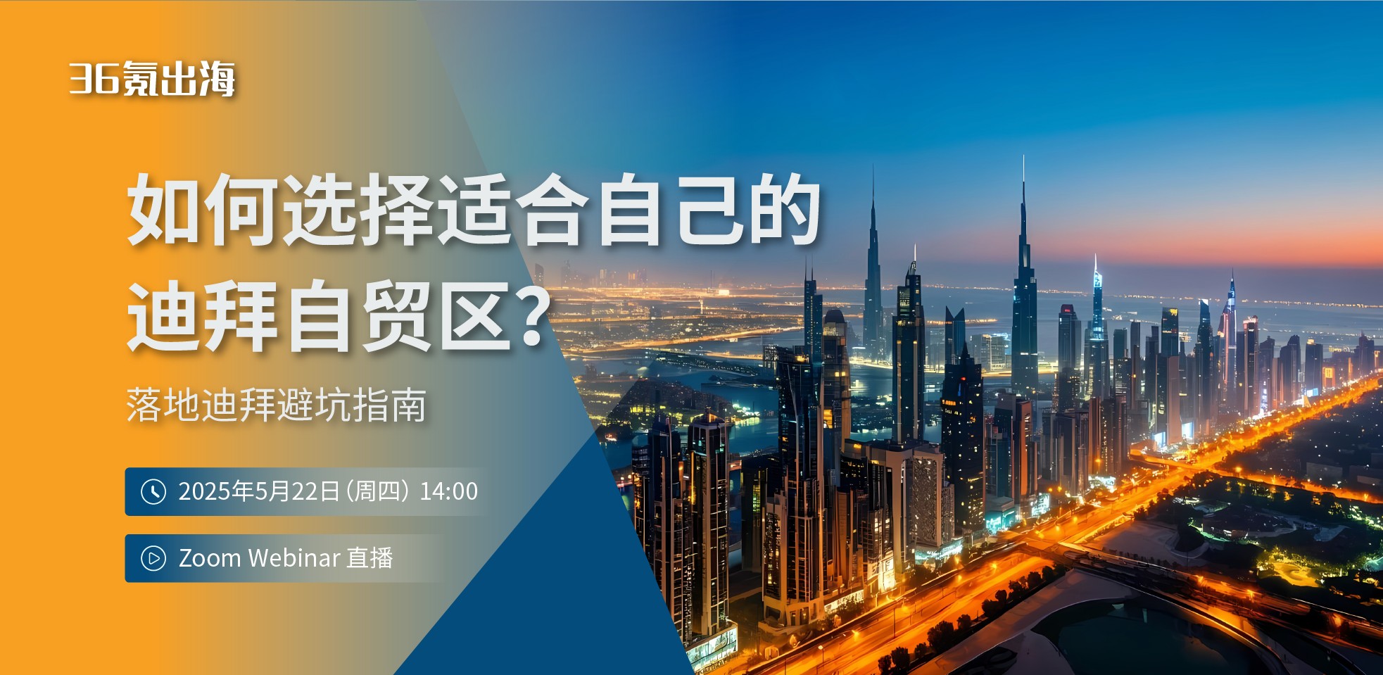 为了帮助企业整理市场信息,澄清决策逻辑,提高落地效率,5月22日,36氪出海将举行线上活动。,主题是“如何选择适合自己的迪拜自贸区?落地迪拜避坑指南”。我们邀请深入中东市场的嘉宾代表,聚焦最值得中国公司关注的迪拜自由贸易区,分析各自的特点,介绍配套服务,为中国企业落地迪拜提供专业建议。