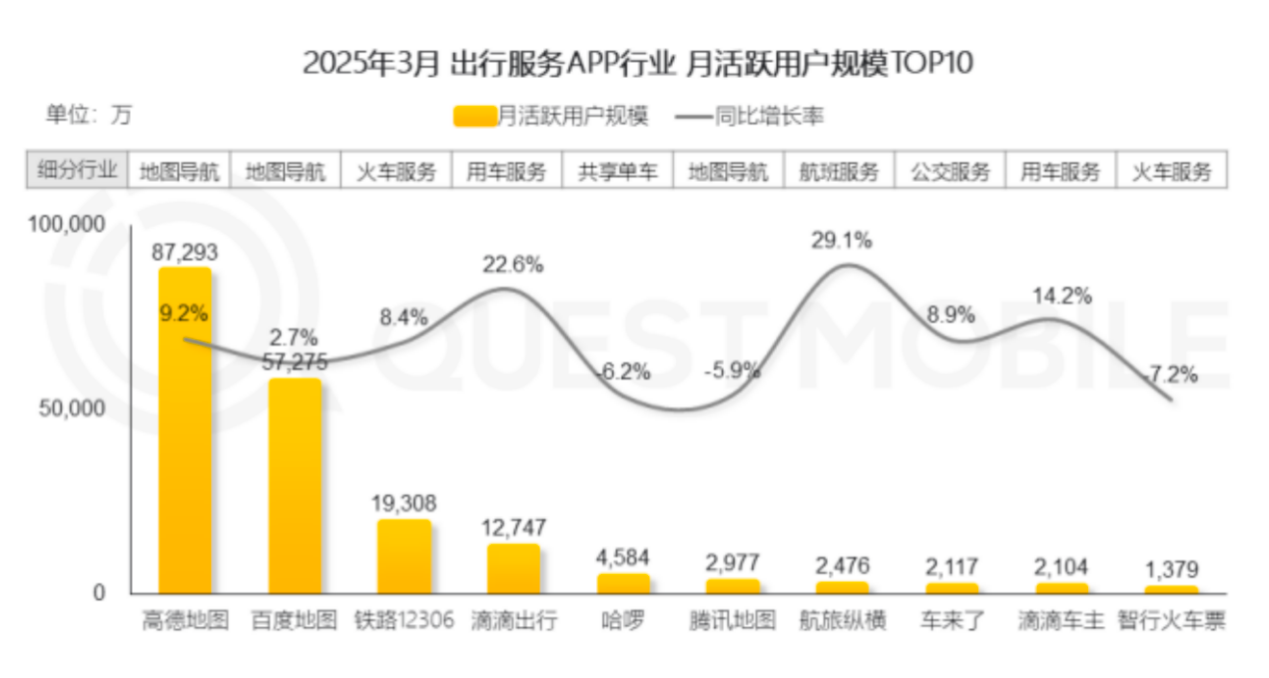 QuestMobile数据显示,截至2025年3月,高德地图以8.73亿月活用户领先的旅游服务APP,而百度地图月活用户为5.73亿,差距显著。自2014年被阿里巴巴全资收购以来,虽然高德地图一直投入研发,但直到2025年才首次实现盈利,可见整个市场的盈利压力巨大。
