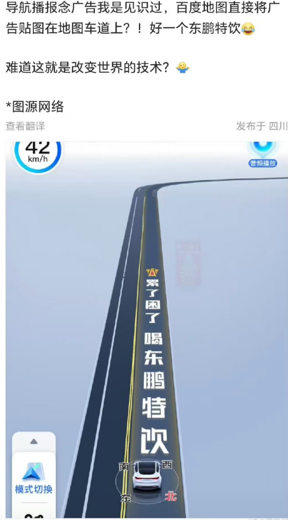 百度地图推出的“车道级广告”被认为是一种激进的场景营销尝试——通过驾驶场景与提神饮料需求的关系,加强品牌曝光。但这种“无孔不入”的广告方式普遍被认为突破了工具产品的底线,面临着法律伦理的多重拷问,其合规性受到质疑,社会责任受到质疑。