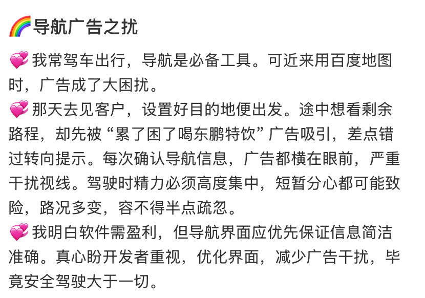 争议的背后是技术和人性化设计的边界问题。有车主质疑:“高速行驶时突然被广告吸引。错过路口或者紧急路况怎么办?”有人指出,如果广告出现在转弯、限速等关键位置,可能会直接误导驾驶判断。虽然有网友认为“免费软件需要保持广告运营”,但争议的焦点是广告的侵入性和潜在的安全隐患。