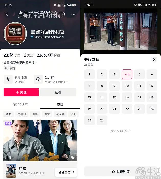 例如,根据我们三易生活的分析,最近抖音开始在短视频信息流中频繁推送长剧集内容。据悉,相关内容的发布帐号多为“抖音放映厅官方矩阵帐号”。与其他账号相比,这类账号的首页不仅有收录自制短视频内容的“作品”栏目,还有收录影视内容的“节目”栏目。其中,“节目”栏目还包括电视剧、电影、综艺节目、儿童等频道,可以支持用户自行搜索相关内容。