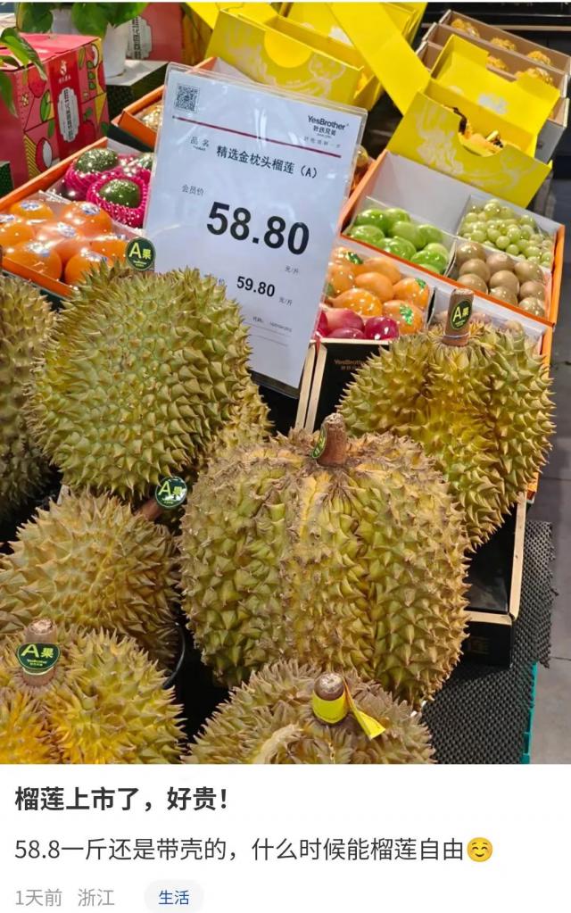 半个月前,有网友发了一篇关于榴莲的帖子:“榴莲上市了,太贵了!58.8 元一斤还是带壳的。”