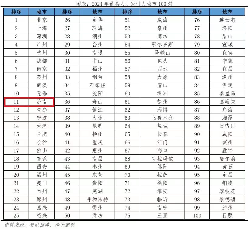 近日,智联招聘联合“泽平宏观”团队发布了《中国城市人才吸引力排名:2025》。报告显示,济南位居全国第11位。
