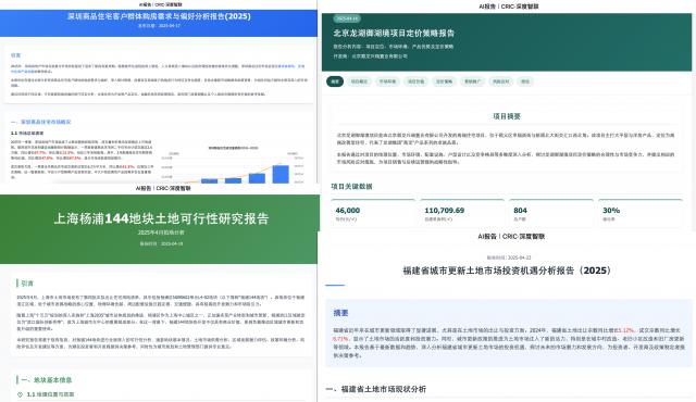 3、撰写研究报告:可生成土地 / 住宅 / 商业等 160 余类市场报告,根据指令一键生成大纲,支持调整,收集数据,匹配数据,支持定制排版,提供酷炫的图形展示。