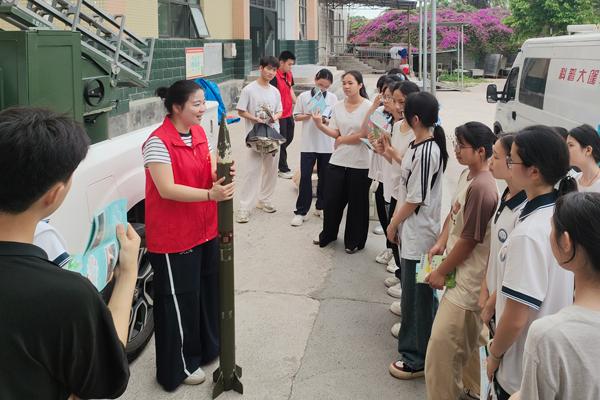 在现场,包括声学、光学、动力学、物理、化学在内的20多个科普展品令人眼花缭乱。在科普志愿者的指导下,学生们穿梭在展品之间,亲自操作各种高难度的动作,如飞行、跳跃、旋转、鞠躬等。,并充分感受到人工智能与机械运动的完美结合,领略到科技的奇妙魅力。钦州市气象局科普志愿者在人工增雨发射车前,向师生详细介绍了气候灾害防灾常识和人工增雨工作知识,激发了学生探索气象科学的兴趣和热情。