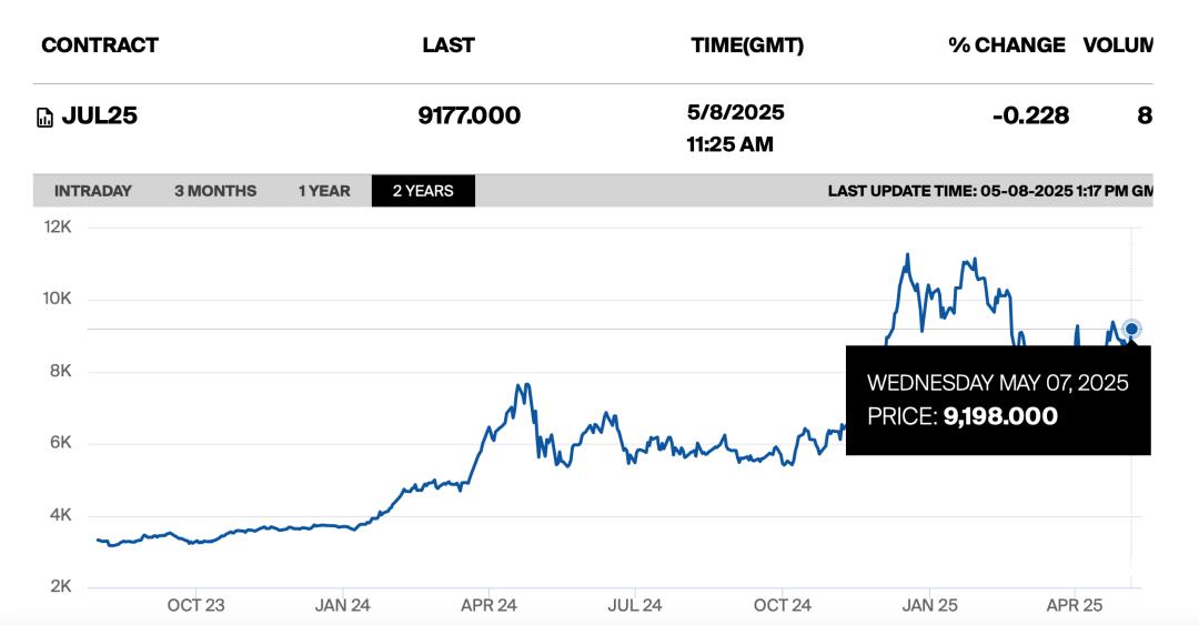 依据国际可可组织(ICCO)数据显示,5月6日,平均交易指导价为8400.6美元/吨,与去年12月中旬11984美元/吨的价格相比有所下降,但与2024年初约4200美元/吨的价格相比,仍处于较高水平。