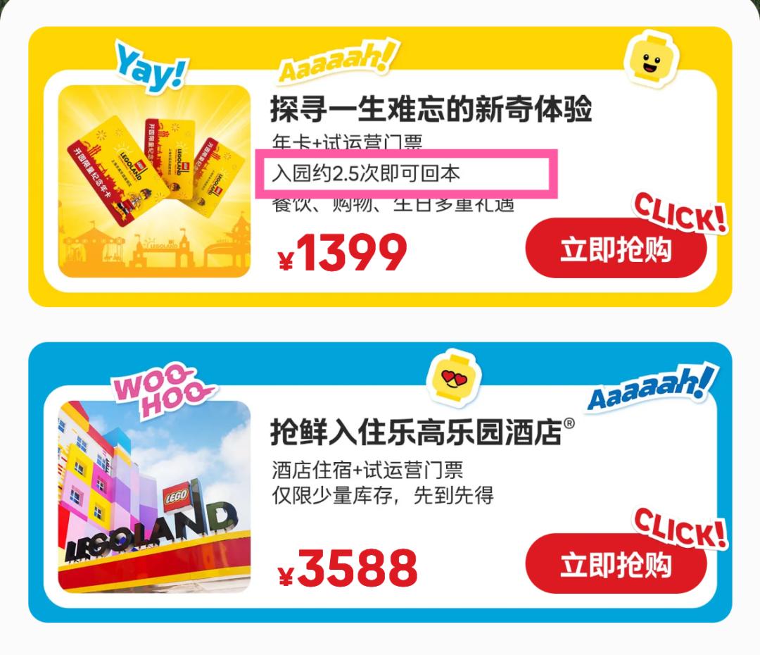 据悉,上海乐高推出了这张1399元开业限量纪念年卡(含一张试运行门票),享受入园日期不少于308天、指定餐饮折扣90%、专属购物折扣券等优惠待遇。据官方介绍,入园2.5次左右即可返还资金。
