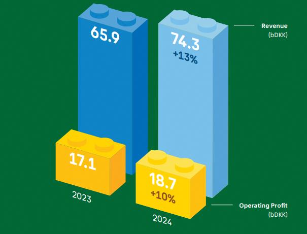 成立于1932年的乐高积木作为世界领先的玩具公司,仍在加速吸金。根据乐高2024年年报,乐高集团年收入同比增长13%至743亿丹麦克朗(约786亿人民币),营业利润增长10%至187亿丹麦克朗(约197亿人民币),再次刷新历史新纪录。2024年,全年推出840款产品系列,其中46%是全新设计,覆盖从幼儿到成人收藏家的各个年龄段客户。