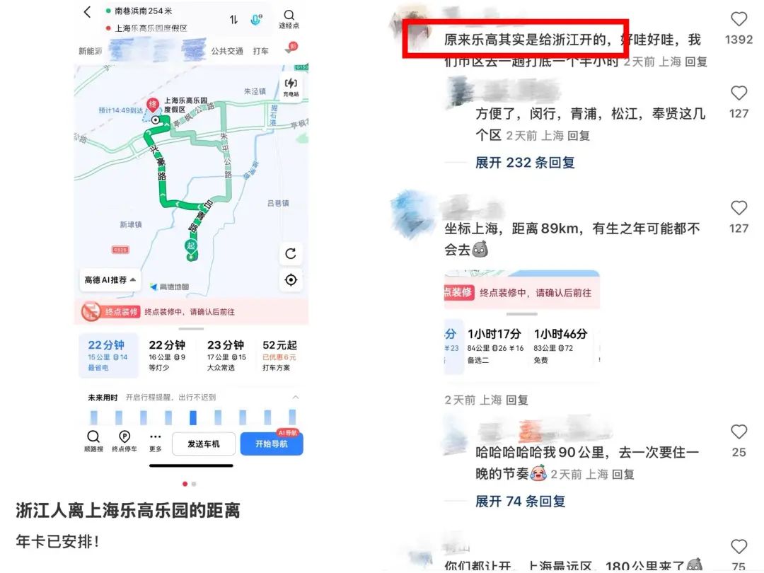 正如阿杰所说,上海乐高乐园位于上海远郊金山区枫泾镇,地理位置不方便。金山区距上海市区约70公里,离浙江嘉兴较近。此外,由于周围没有地铁等公共交通设施,许多上海市民调侃说,“上海乐高实际上是为浙江开的”。