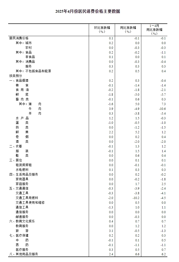 根据国家统计局网站的消息,2025年4月,全国居民消费价格同比下降0.1%。其中,城市持平,农村地区下降0.3%;食品价格下降0.2%,非食品价格持平;消费品价格下降0.3%,服务价格上涨0.3%。1-4月份,全国居民消费价格较去年同期下降0.1%。