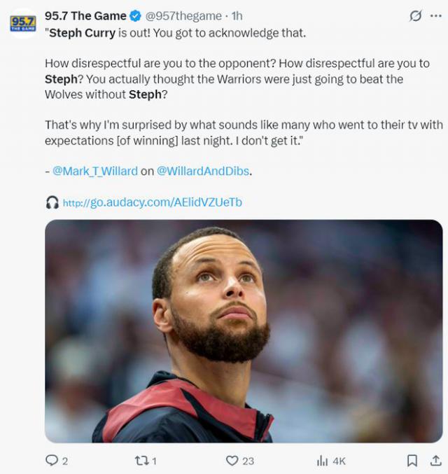 湾区媒体 95.7The Game 写作:斯蒂芬 - 库里不能出现。你必须承认这一点。没有库里,你想轻松进球。你对森林狼有多不尊重?你对斯蒂芬有多不尊重?没有库里,每个人都想继续战胜森林狼?