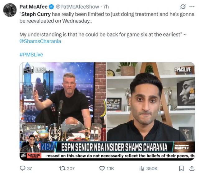 Shams 据报道,库里将在美国时间的星期三进行复查。目前他只能做常规治疗(不言而喻,他不能做投篮训练和对抗训练)。估计库里最早会在。 G6 才能复出。