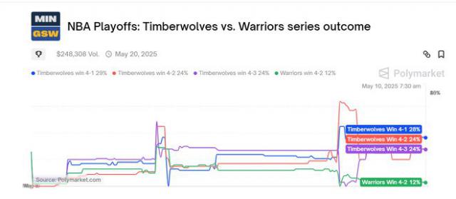 最近的晋升概率,森林狼依然高达 而勇士晋升的概率只有76%, 24%。(与昨天的比赛相比,晋升的可能性有所提高。 昨天勇士只剩下2%了 22%)。