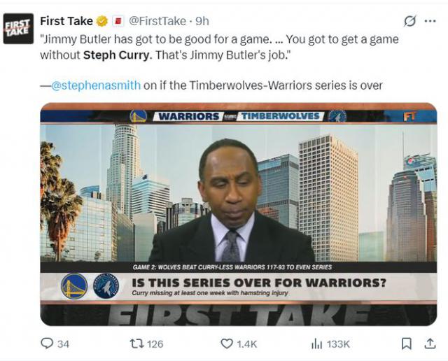 TNT 斯蒂芬的评论员 -A- 在播客节目中,史密斯说:“当斯蒂芬 - 吉米不能出现在库里 - 巴特勒总是要打得好吗?在库里缺阵的比赛中,你至少要赢一场,这是巴特勒的职责。”