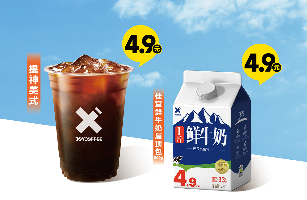 新佳宜自主品牌以“质价比”为核心战略,通过精准的成本控制和市场定位,深度覆盖鲜奶、水饮、食品、日用品等高频消费品类,打造有影响力的价格体系。其中,4.9元/斤的鲜奶、3.9元/斤的鲜啤、4.9元/杯的美式咖啡等标杆单品价格比市场上同类产品下降了30%-50%,迅速渗透到消费市场,标签上有着“高质量、低成本”的鲜明标签。