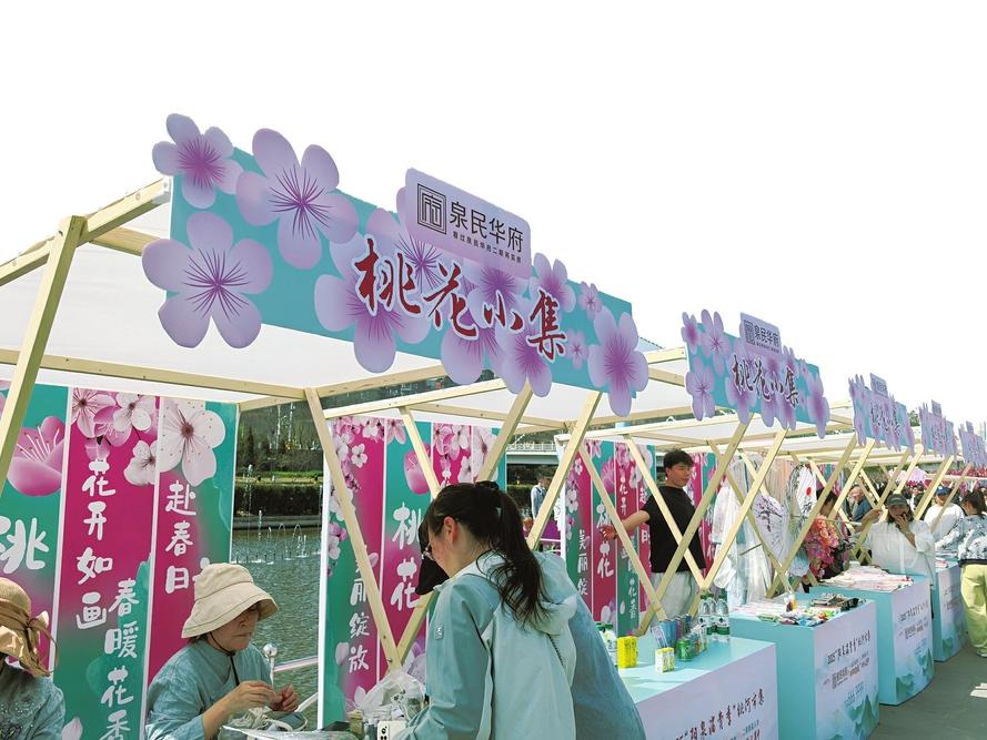 5月6日上午,桃河公园人头攒动。穿着汉服的女孩手里拿着一扇扇子,和桃花合影。孩子们追着飘落的花瓣玩耍和奔跑。在河边蜿蜒的市场摊位前,游客们正争相品尝富硒小米粥,购买非遗砂器...这个以“十里桃花映山城”为主题的桃河市场已经持续了一个月,让阳泉的“赏花经济”生成充满活力。