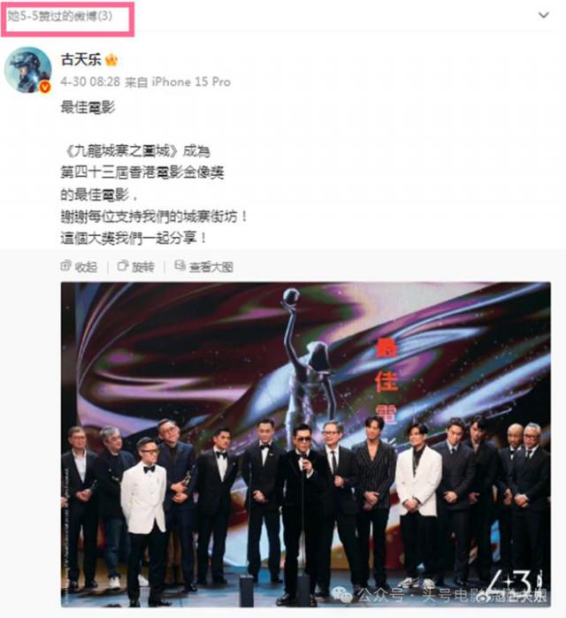去年古天乐的电影《九龙城寨之围城》上映时,宣萱也晒出了电影票根,亲自去电影院支持。今年,当这部电影获得香港电影金像奖最佳影片时,宣萱称赞了古天乐发布的获奖内容,这对他们来说太好了,不用说了。