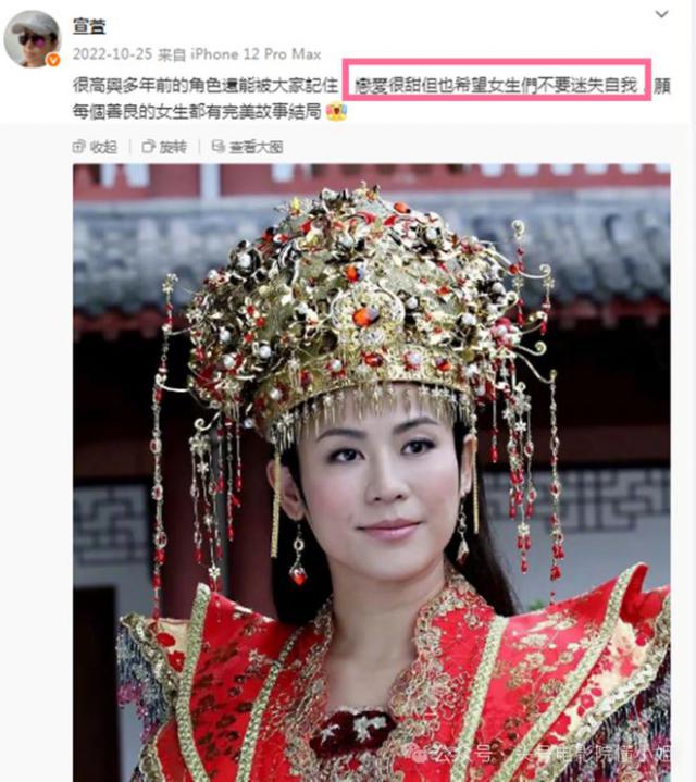 她曾经发过一篇文章,说,“我很高兴很多年前的角色还能被大家记住。爱情很甜蜜,但也希望女生不要迷失自我。愿每一个善良的女孩都有一个完美的故事结局。”