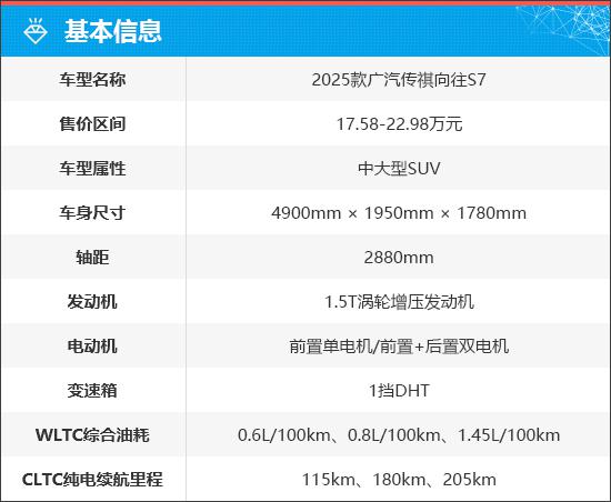 广汽传祺憧憬 S7 共推出 6 汽车,售价区间为 17.58-22.98 一万元,结合国家置换补贴等优惠后,售价区间为 15.48-20.88 一万元。动力方面,新车搭载 1.5T 发动机 单电机 / 插电式混合动力系统由双电机组成,CLTC 综合续航最长可达 1150km。