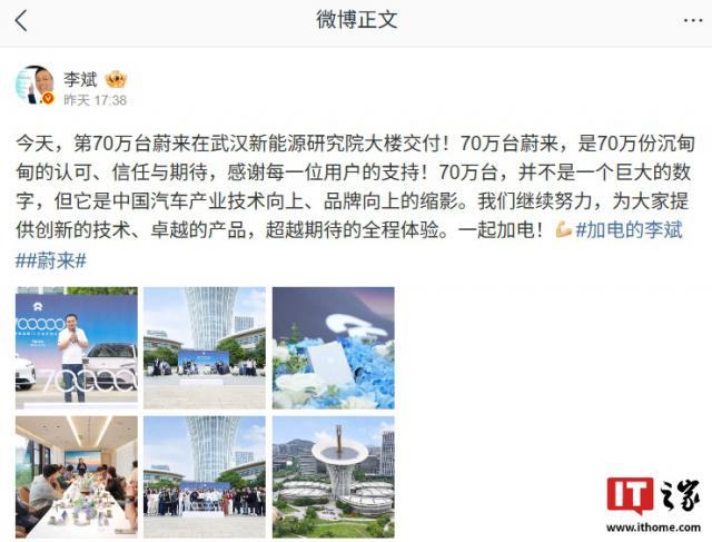 IT 世家 5 月 11 每日新闻,蔚来创始人,董事长,CEO 昨天晚上,李斌发布了一条消息:第 70 万台蔚来交付到武汉新能源研究院大厦。李斌微博原文如下:
