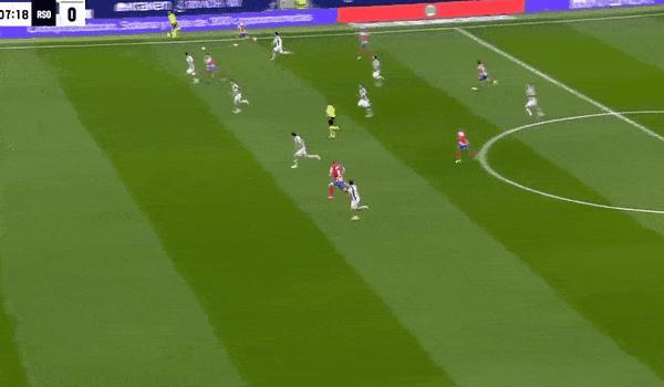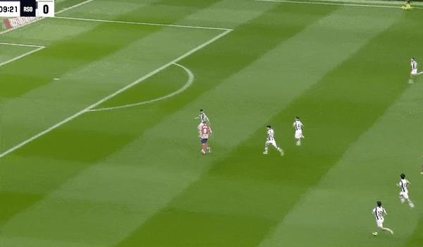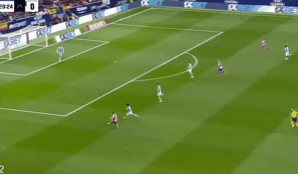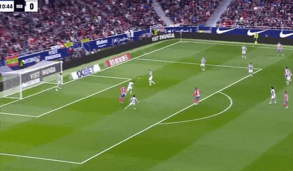 西甲第 35 轮子,马竞主场对阵皇家社会。第一 7 马竞右路进攻,巴里奥斯传中,后卫在前点没有遇到球,索尔洛特在后点不停地进球,直接进球,高速飞进网窝,1-0。
