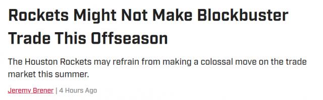 现在,火箭的处境并不尴尬,所以交易并非势在必行。但是,如果有合适的机会,他们也不会错过加强的机会。这个夏天他们有主导地位。
