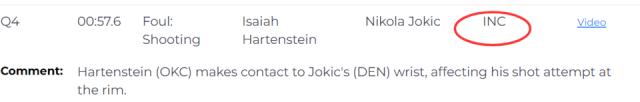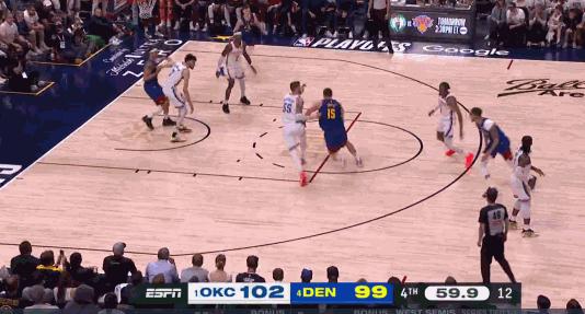 第四节最后两分钟唯一一次漏判,出现在第四节结束和第四节结束。 57.6 秒。当时约基奇持球突破内线,在哈滕的影响下失败。根据裁判的报告,哈滕实际上击中了约基奇的手腕,这影响了他的投篮。这是一个错误的投篮犯规,约基奇应该得到两个罚球机会。在这次漏判中,掘金遭受了损失,雷霆获利了。