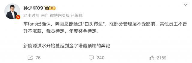 12 月 5 日本,微博认证汽车博主“孙少军”爆料,除部分管理层外,奔驰总部对其他员工采取不升职、不加薪、裁员待定等措施,引起广泛关注。虽然官方还没有回应,但奔驰今年的情况确实不容乐观。