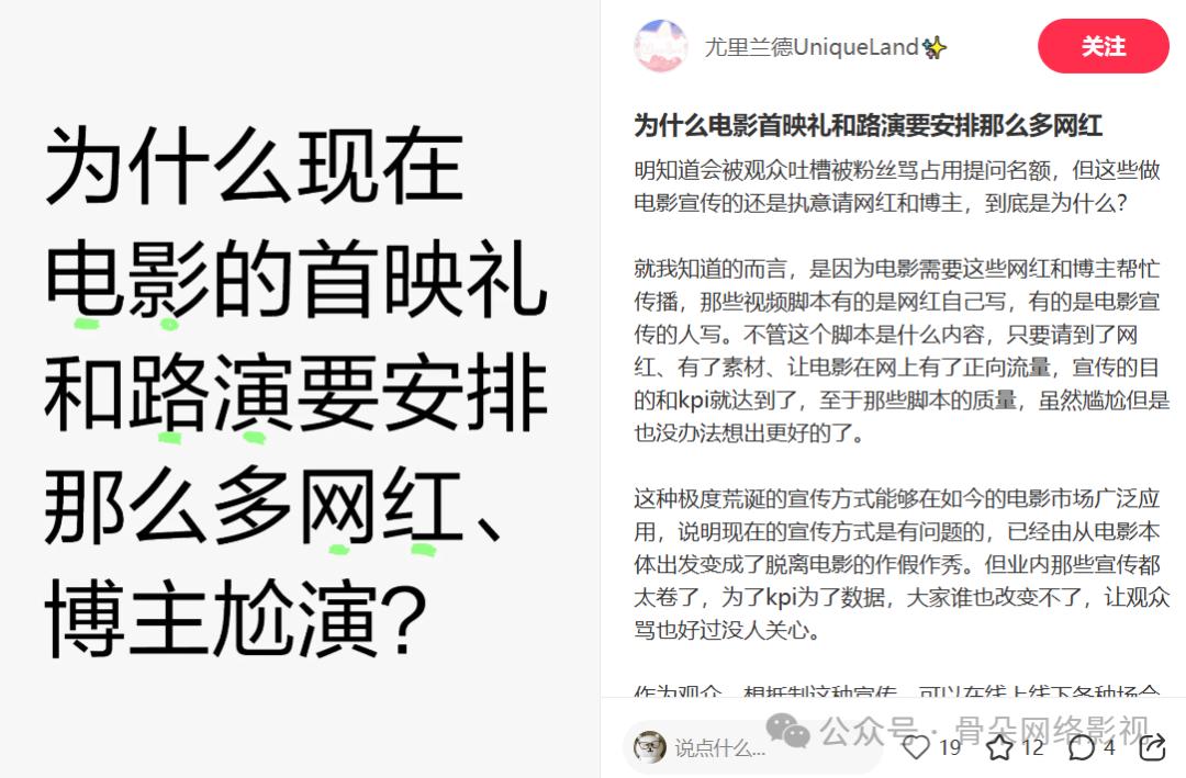 s告诉骨朵,观影团邀请网络名人参与互动的原因在于电影人的要求和公告安排:“现在最大的要求是看KOL能邀请多少人气。我们会列一张表,总结小红书、微博、抖音的KOL,统计他们的粉丝数量。”
