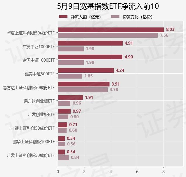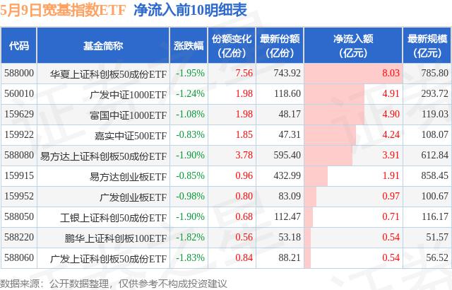 当天有 34 只宽基指数 ETF 资金净流入出现在基金中,其中华夏上证科技创新板排名第一。 50 成分 ETF(588000),份额增加 7.56 十亿份,净流入额为 8.03 亿元。