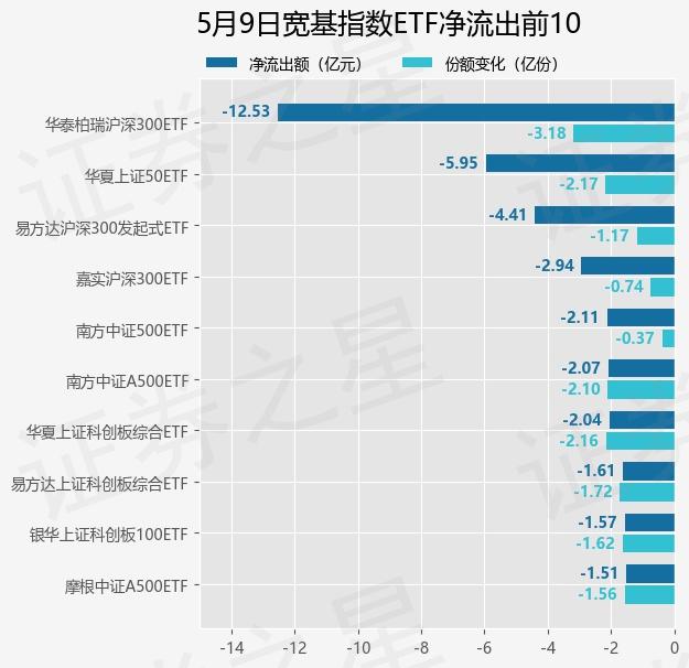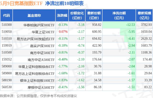 当天有 123 只宽基指数 ETF 资金出现净流出,其中华泰柏瑞沪深深排名第一。 300ETF(510300)减少了份额 3.18 一亿份,净流出额为 12.53 亿元。