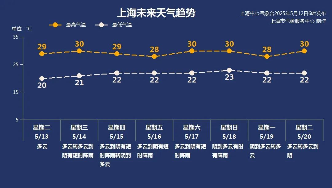 五月十四日(星期三):阴天转多云到阴天有短时阵雨,21~30℃