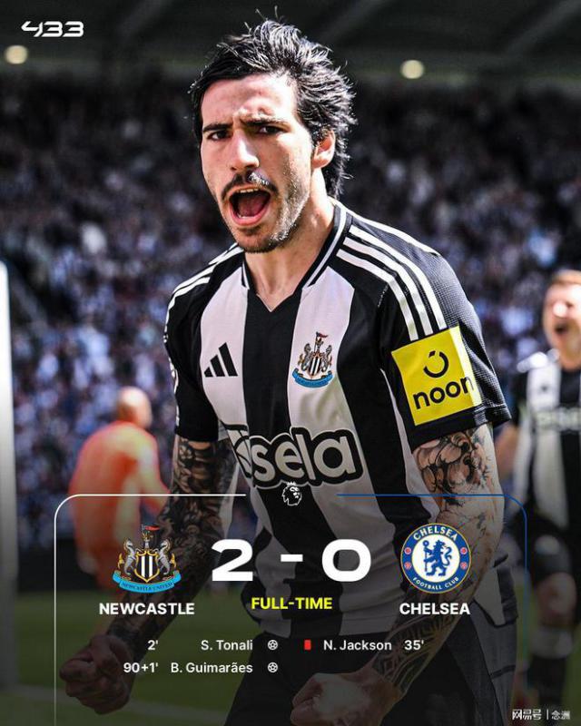 切尔西客场 0-2 不敌纽卡斯尔,纽卡超越曼城升至第三,蓝军 5 连胜结束。托纳利闪击破门,杰克逊肘击被直红罚下,吉马拉斯锁定胜利。