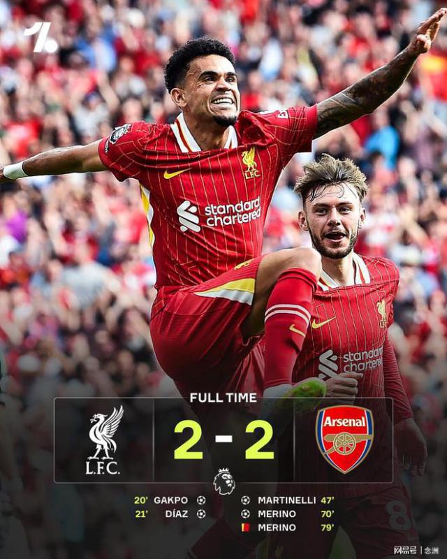 英超第 36 利物浦主场主场轮焦点战, 2-2 战平阿森纳,后者还剩下。 2 在第五轮的情况下,切尔西领先。 5 分数。加克波和路易斯 - 迪亚斯 2 分分钟破门,马丁内利接到特罗萨德的助攻扳回一球,梅里诺扳平,随后两黄变一红被罚下。
