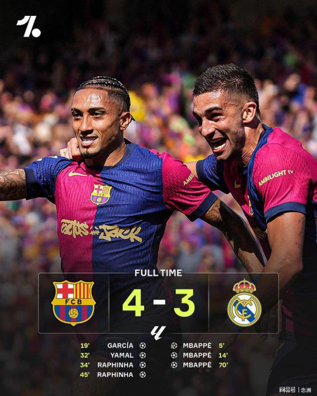 西甲第 35 德比轮国家,巴萨主场主场 4-3 本赛季四杀皇马,两队积分差距扩大至皇马。 7 得分,巴萨下一轮进球夺冠。姆巴佩 14 分钟双响,加西亚拉回一座城市,亚马尔和拉菲尼亚 1 分钟 2 球反超,拉菲尼亚梅开二度扩大比分,费兰助攻戴帽,下半场姆巴佩帽子戏法 联赛 27 球队登上了射手榜,维尼修斯助攻双响,拉菲尼亚失去了空门,琼阿梅尼手球没有判断引起争议。