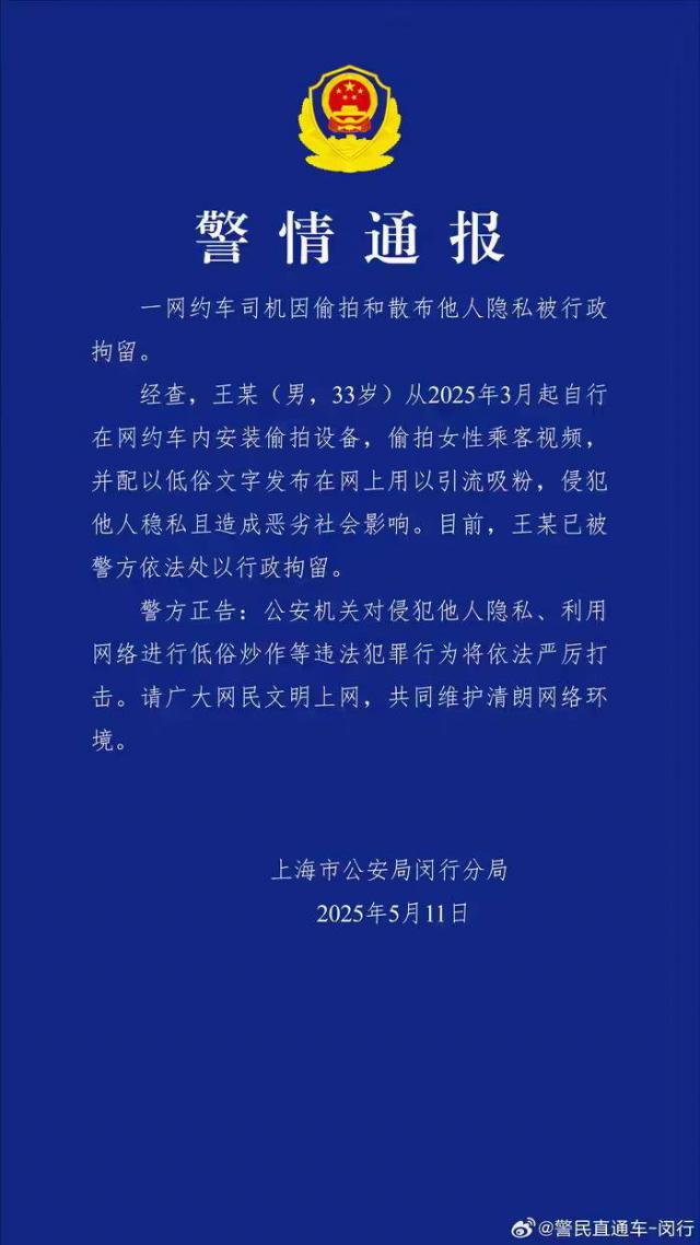记者从上海警方获悉,5 月 11 日上海市公安局闵行分局发布警情通报:一网约车司机因偷拍、散布他人隐私被行政拘留。