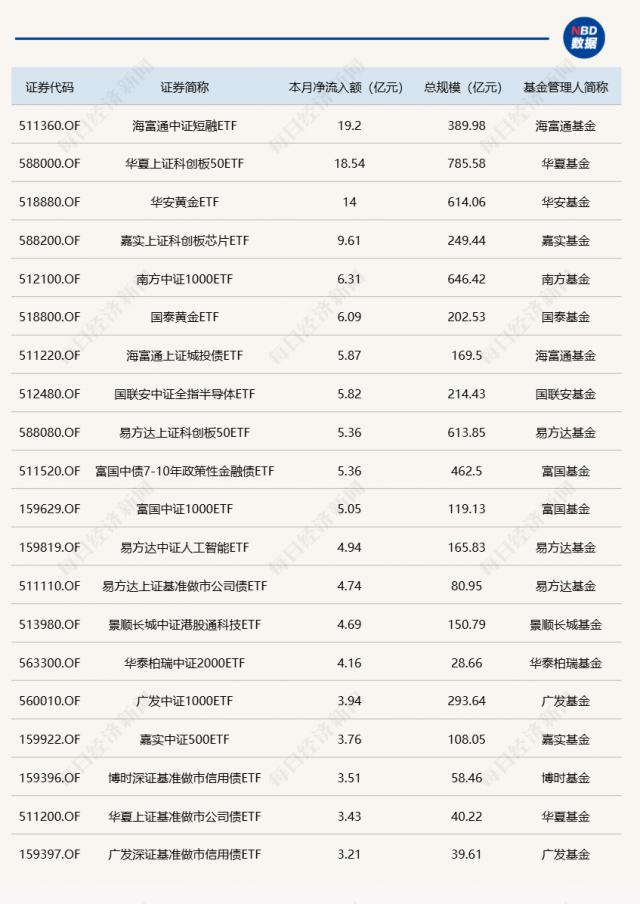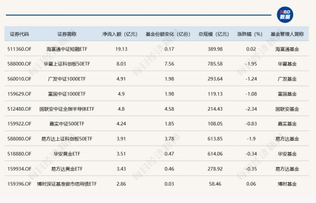 Wind 数据显示,是的 5 月 9 日的非货币 ETF 在市场上,海富通中证短融 ETF 增加了基金认购 0.17 十十亿份,净流入额为 19.13 亿元;华夏上证科技创新板 50ETF 份额增加 7.56 十十亿份,净流入额为 8.03 亿元;广发中证 1000ETF 份额增加 1.98 亿份,净流入额为 4.91 亿元。