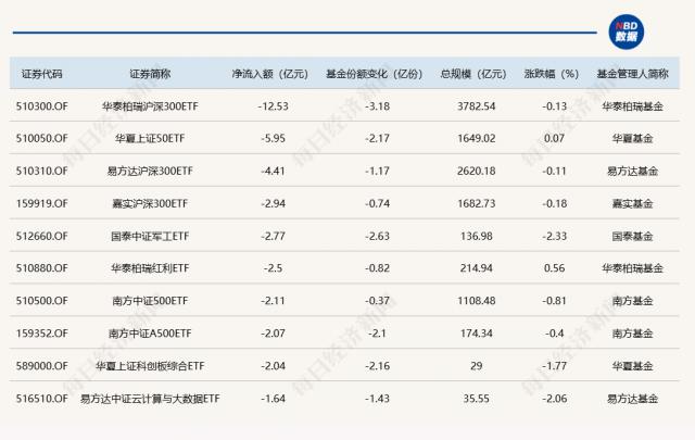 同时,华泰柏瑞沪深 300ETF 减少基金认购 3.18 一一一亿份,净流出额为 12.53 亿元;华夏上证 50ETF 份额降低 2.17 一一一亿份,净流出额为 5.95 亿元;沪深易方达 300ETF 份额降低 1.17 一一一亿份,净流出额为 4.41 亿元。