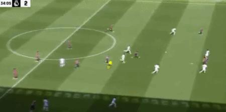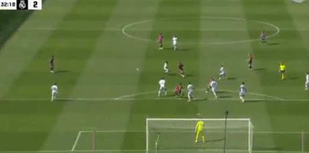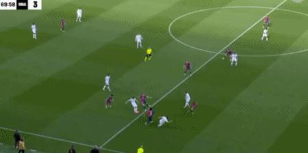 第 69 不到一分钟,莫德里奇中场断球直塞,维尼修斯突破禁区后无私横传,姆巴佩无人看守。