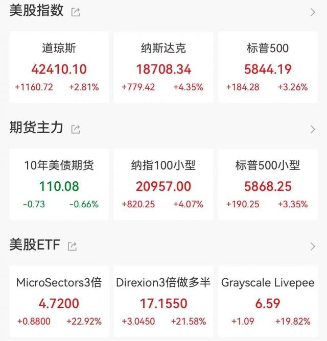 道琼斯工业平均指数暴涨 1,160.72 点,涨幅达 2.81%,收在 42,410.10 点,日内几乎一路上涨,收盘买盘持续活跃,呈现出强劲的上涨动能。标准普尔 500 指数则上涨 3.26%,收在 5,844.19 点,自 4 自从月中旬跌至低点以来,累计反弹幅度已经超过 20%。这一指数今年以来的跌幅也大幅缩小至今 0.6%。纳斯达克综合指数表现最为强劲,收涨 4.35%,报 18,708.34 点。
