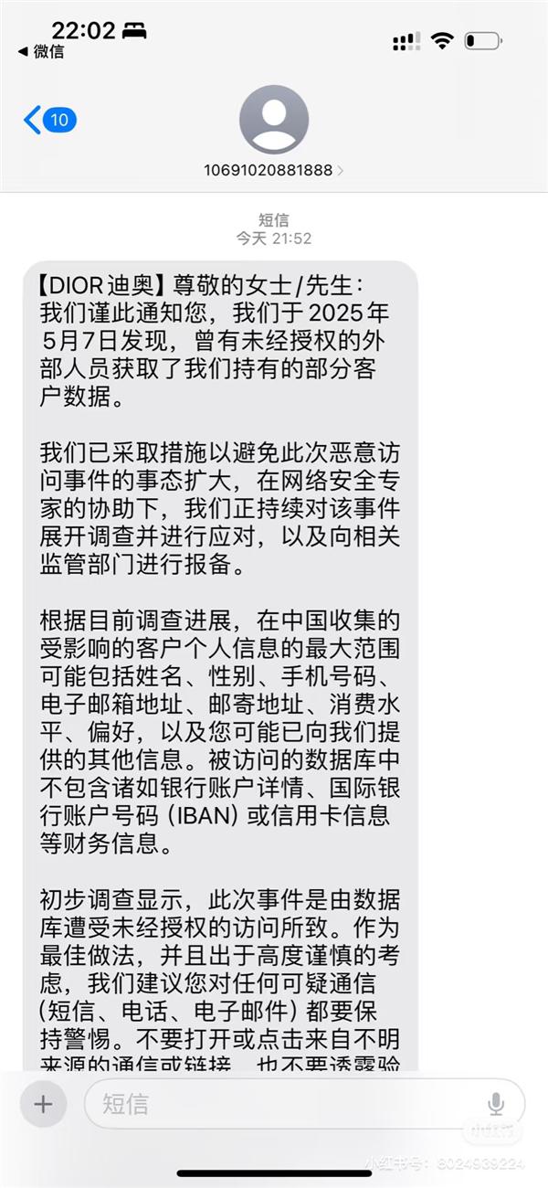 在短信中,迪奥向顾客道歉,并指出保护顾客的个人信息始终是迪奥的首要任务。