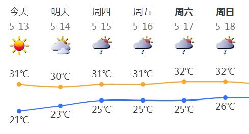 深圳气象台预报,我市今日晴天转多云;温度 21 ℃ -31 ℃;东风 3-4 等级;相对湿度 45%-80%。