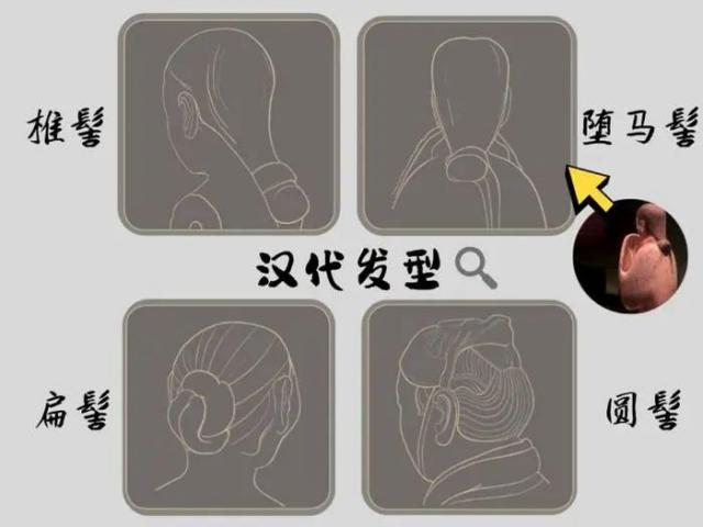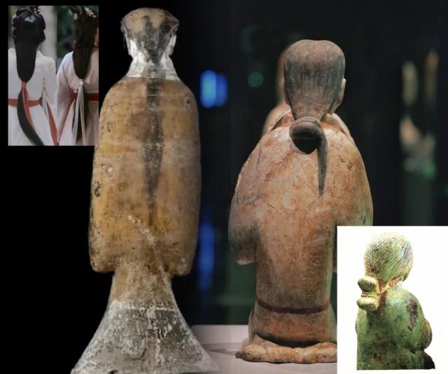这种发型是西汉经典的发型,有人称之为“”堕马髻""垂髻“,这种发型的特点是发型前区分为中间区域,两侧靠近头皮,到达脖子后面的头发或扎成一股,有的拔出一缕下垂,形成层次感。