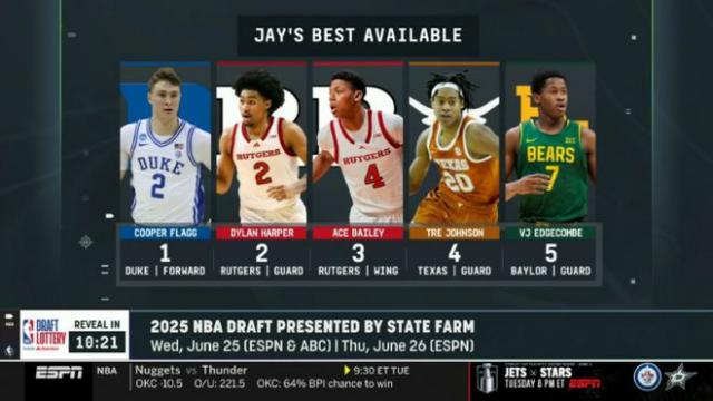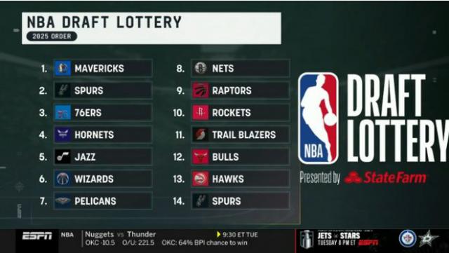 北京时间 5 月 13 日,2025 年 NBA 芝加哥举行了选秀乐透抽签仪式,独行侠以 1.8% 小概率爆冷抽到状元签,创造 NBA 历史第 4 获得第一名记录的概率很低。独行侠很有可能从杜克大学选择弗拉格作为第一名,加上独行侠和浓眉哥和欧文,有望建立三状元阵容。