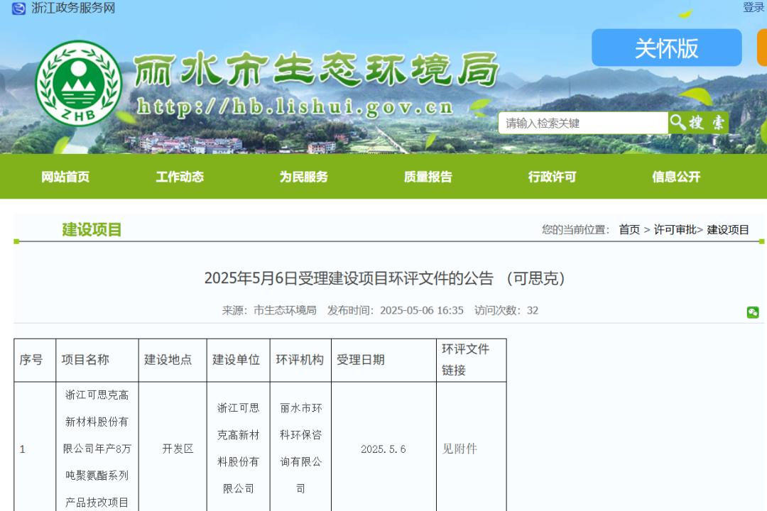 2025年5月6日,丽水市生态环境局发布《浙江可思克高新材料有限公司年产聚氨酯系列产品技术改造项目8万吨》环评受理公告。