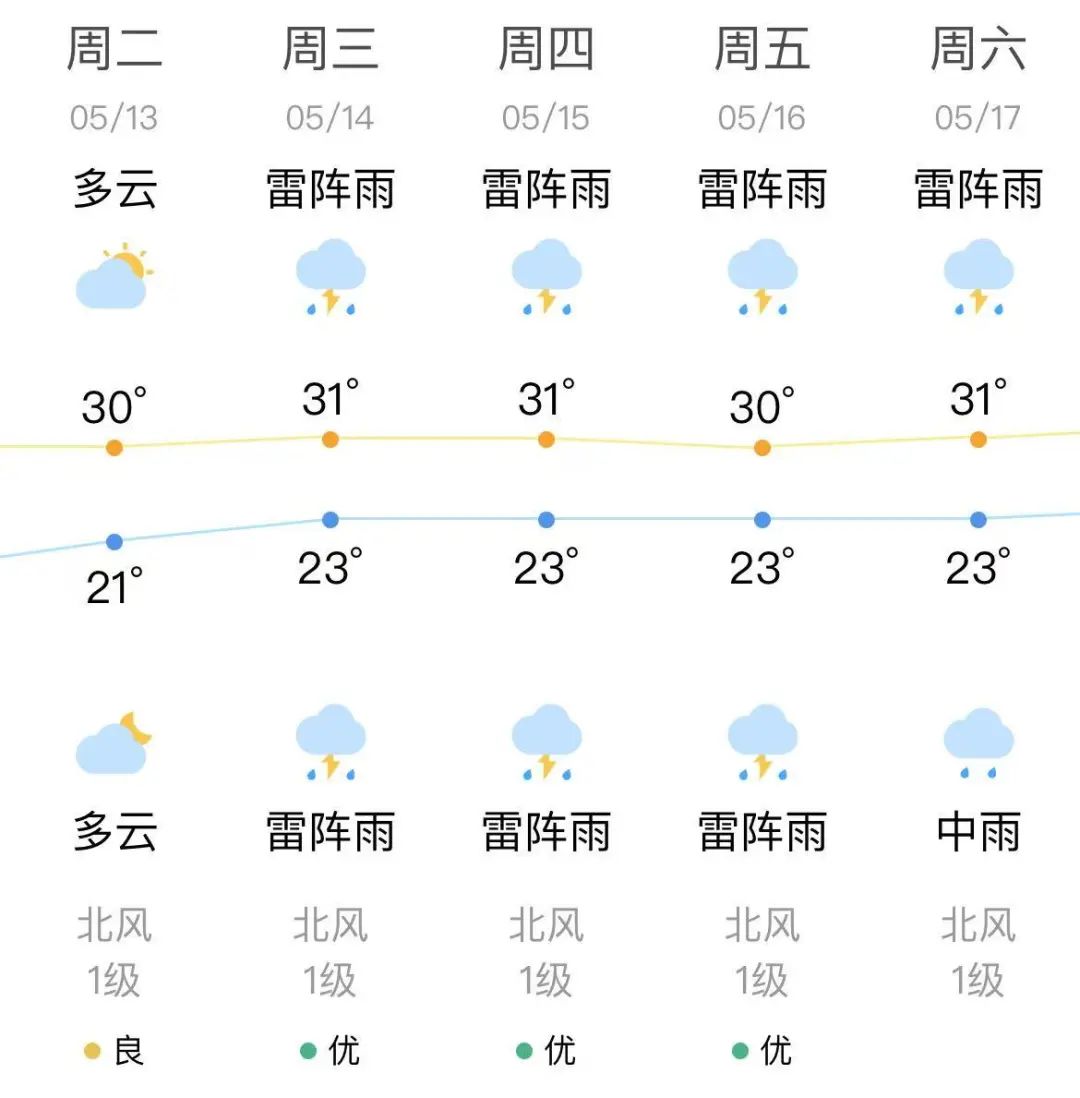 五月十三日,以晴至多云为主,气温18-30℃。;