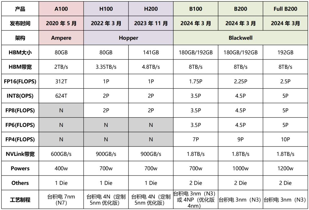 例如,基于 Volta(伏特)架构的V100,基于 Ampere(安培)架构的A100,基于 Hopper(赫伯)架构的H100、H200,基于 Blackwell(布莱克威尔)架构的B100、B200等。