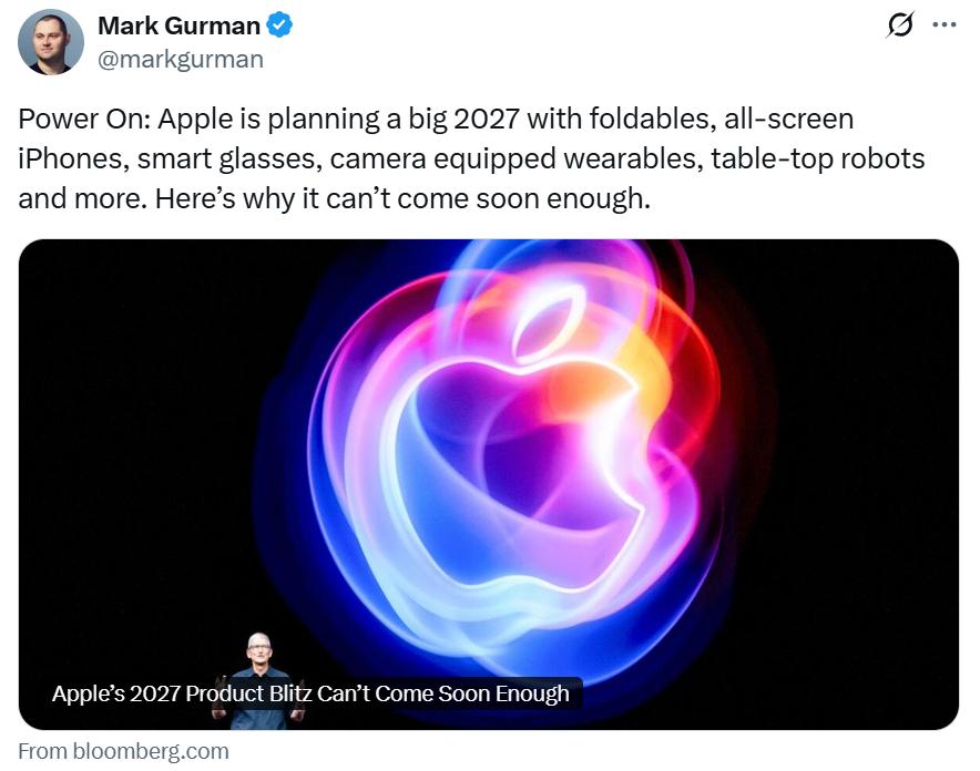 根据彭博社 根据古尔曼最新曝光的2027年产品清单,苹果将带来五款划时代的新产品。