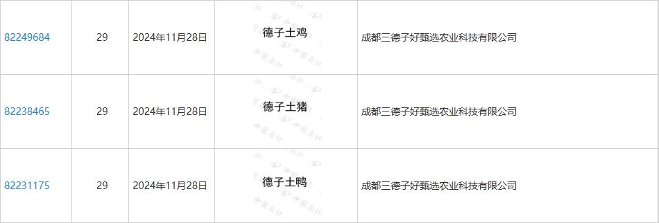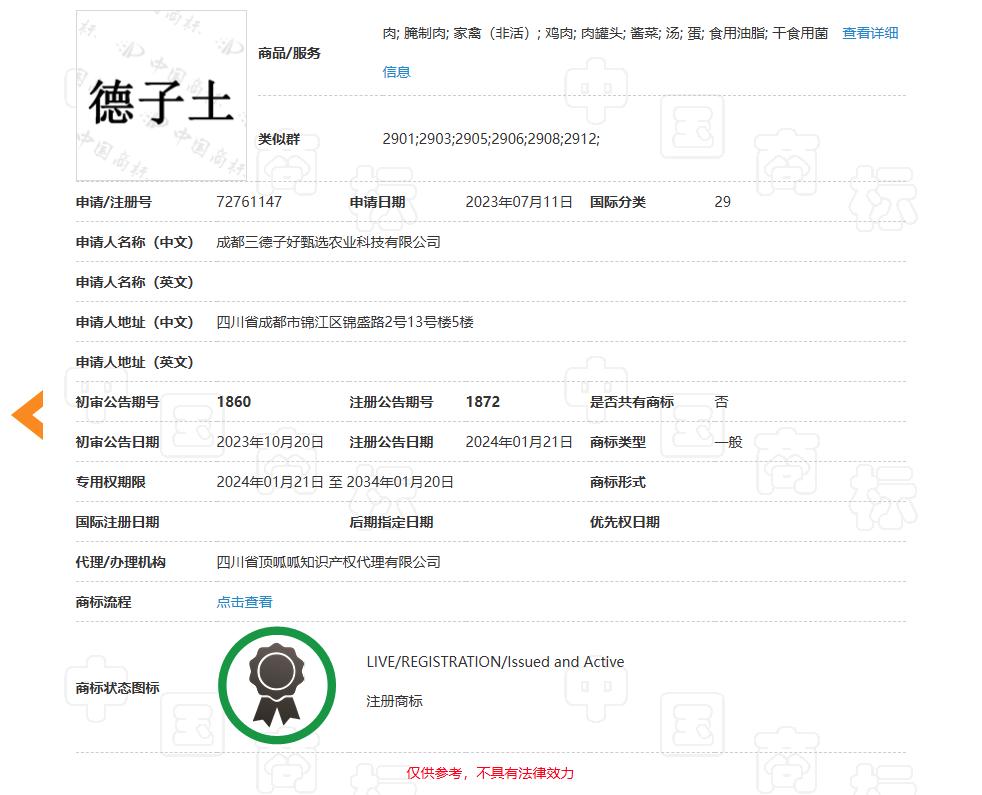 知识产权查询中国商标网信息了解到,在成都三德子好选农业科技有限公司的商标信息中,申请了三德子、三德子好选、德子土、德子土鸡等多个商标注册。在这些商标中,“德子土”商标由自然人李某于2023年7月申请注册。、30、31、35、2024年1月注册公告40类商品或服务。2024年5月,第29类商品上的“德子土”商标(肉类、鸡肉等)已转让至成都三德子好农业科技有限公司名下。